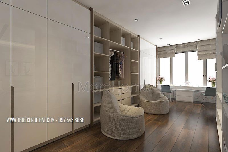 Thiết kế kệ tủ quần áo âm tường cũng góp phần lớn tiết kiệm không gian cho căn phòng